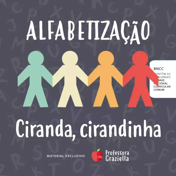 Atividade de Alfabetização sobre a cantiga “Ciranda, cirandinha“. Os exercícios incluem a leitura da cantiga, questões de identificação de informação, organização dos versos em ordem usando recortes, identificação de palavras da cantiga, caça-palavras e produção artística. O material tem 7 páginas e 14 exercícios.
